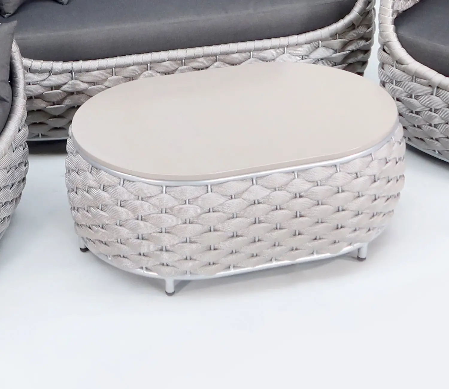 Platte aus Faserzement, Gestell aus Metall, bespannt mit modernem Rope-Geflecht. Mit diesem schönen Loungetisch machen Sie Ihre individuell zusammengestellte Gartenlounge perfekt! Die Loungemöbel Reihe LILIENSTEIN überzeugt durch Eleganz, Komfort und größte Robustheit gegenüber Witterung.