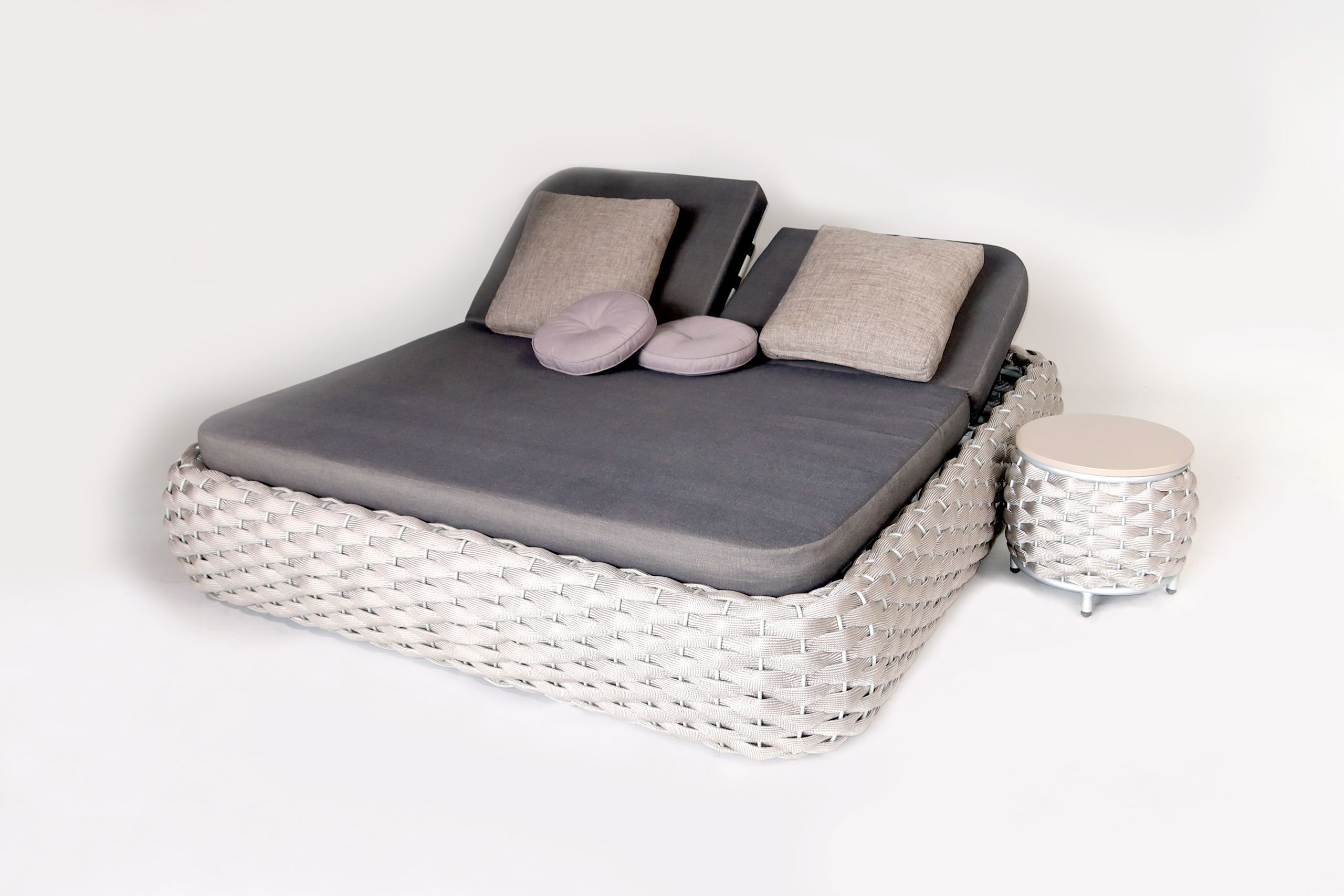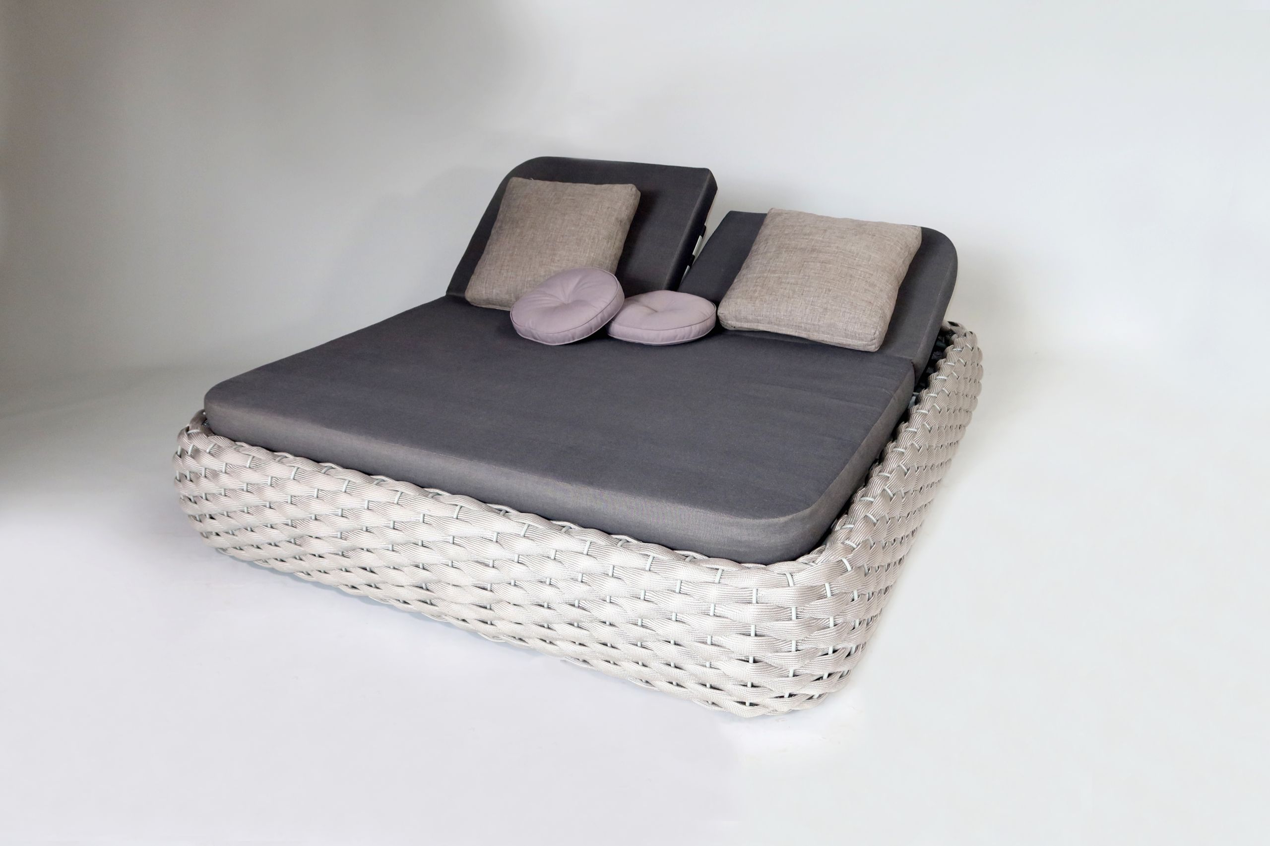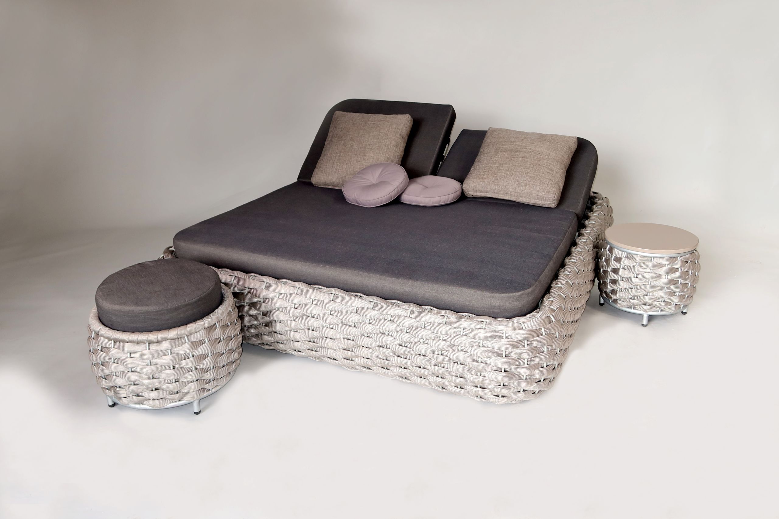 Stahlrohrgestell und strapazierfähiges Polyesterstrick. Bespannt mit horizontalen XL-Rope-Geflecht in modernster Kordeloptik. Inklusive bequemen Rückenkissen, zwei kleinen Zusatzkissen und Sitzpolster. Polster mit Reißverschluss und waschbar bis 30°.